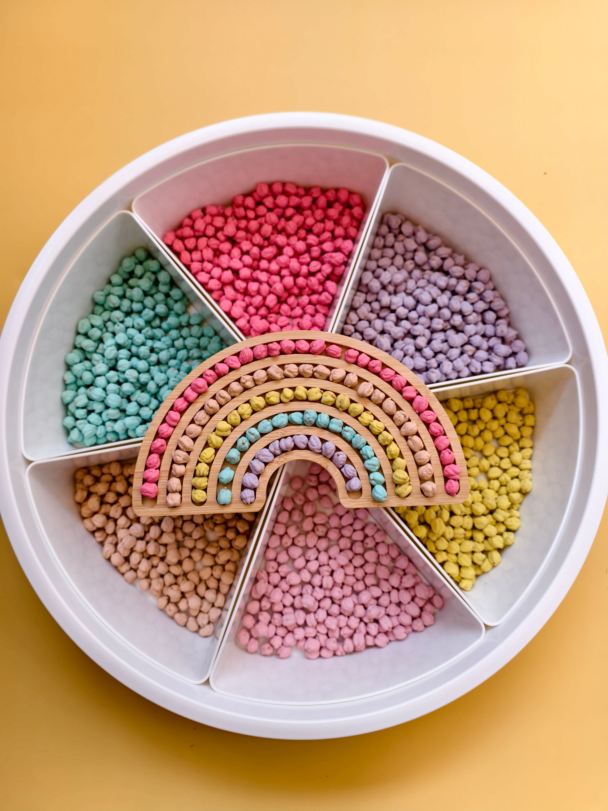 Dale un toque suave y encantador al juego sensorial con Garbanzos de Colores Pastel. Esta mezcla delicadamente teñida en tonos suaves invita a los niños y niñas a explorar texturas, hacer trasvases, clasificar por colores y dejar volar la imaginación.