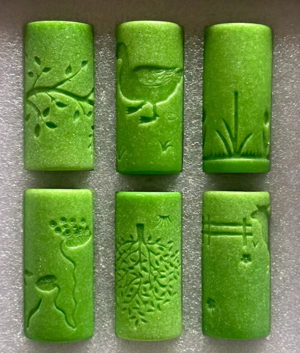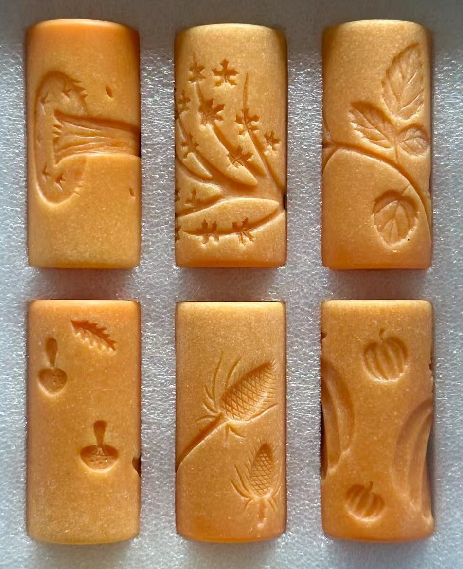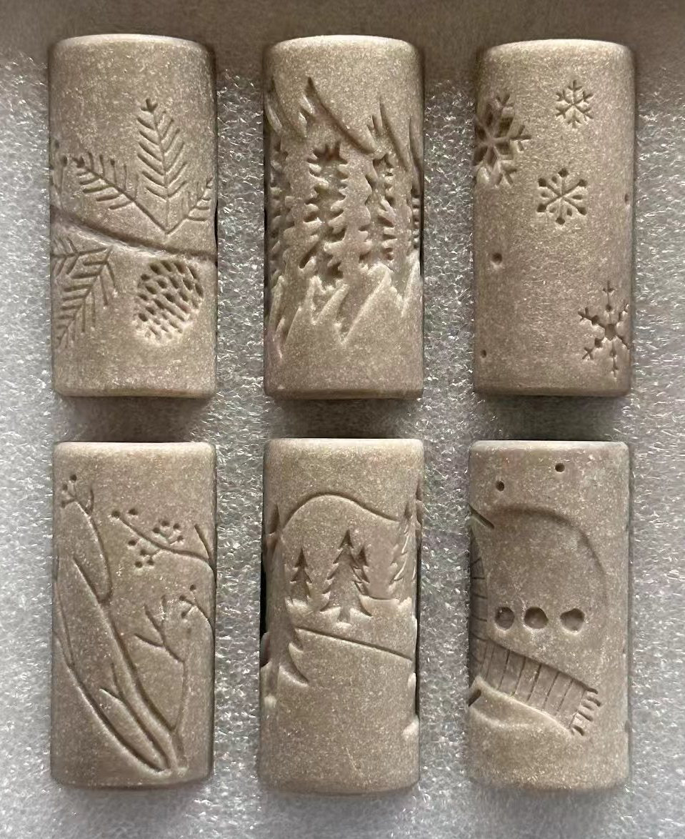 Cada set incluye 6 cilindros de mármol con texturas y estampados únicos, diseñados para acompañar el juego sensorial y creativo con plastilina.